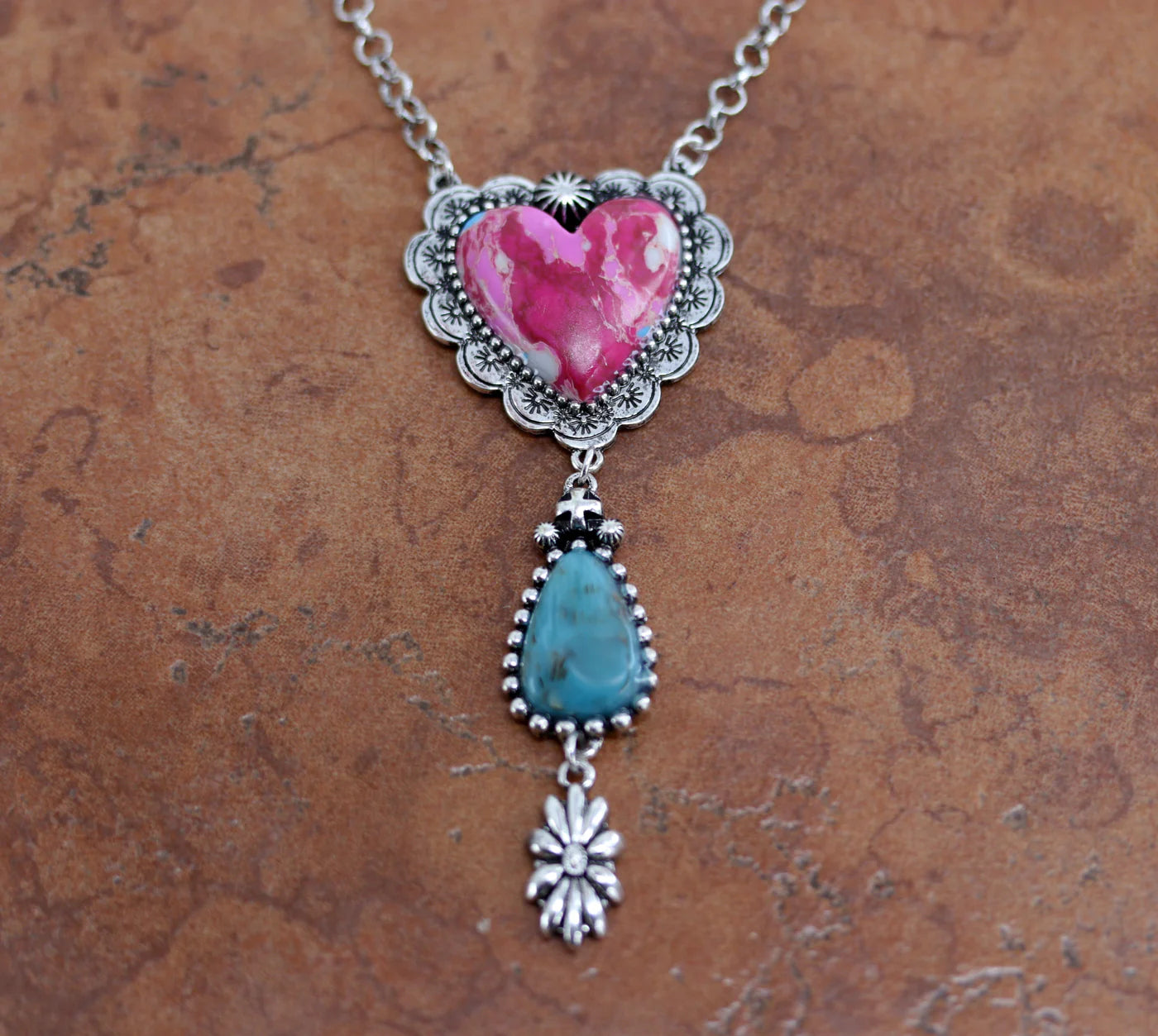 Beautiful necklace that is 17" in length plus the 3" extender. The pendant is 3 7/8" in length. It is made from zinc alloy and man made stones.