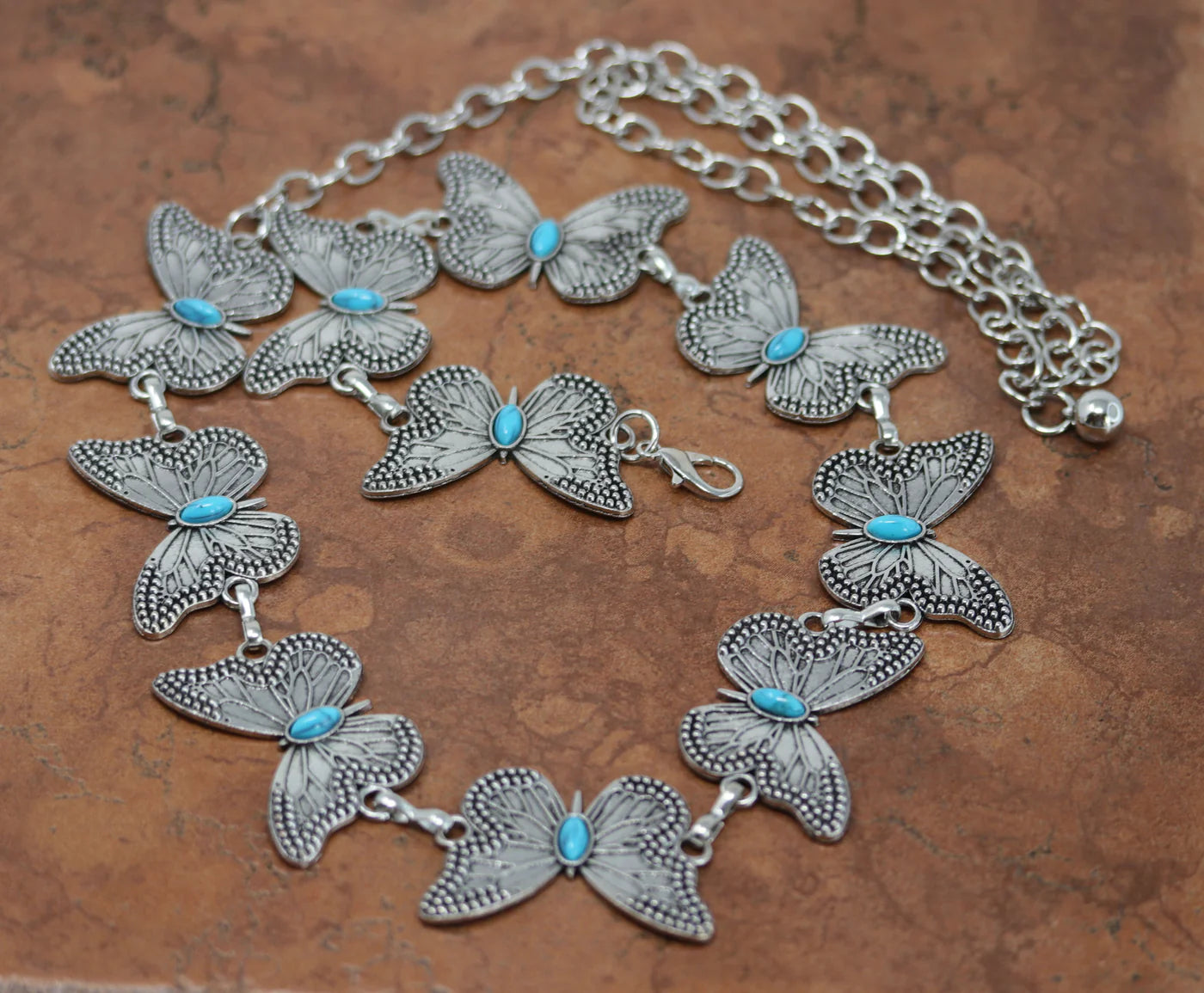 A beautiful fashion link belt made from zinc alloy and man made turquoise. The belt measures 44" in length and 1 1/2" in width (larger conchos).