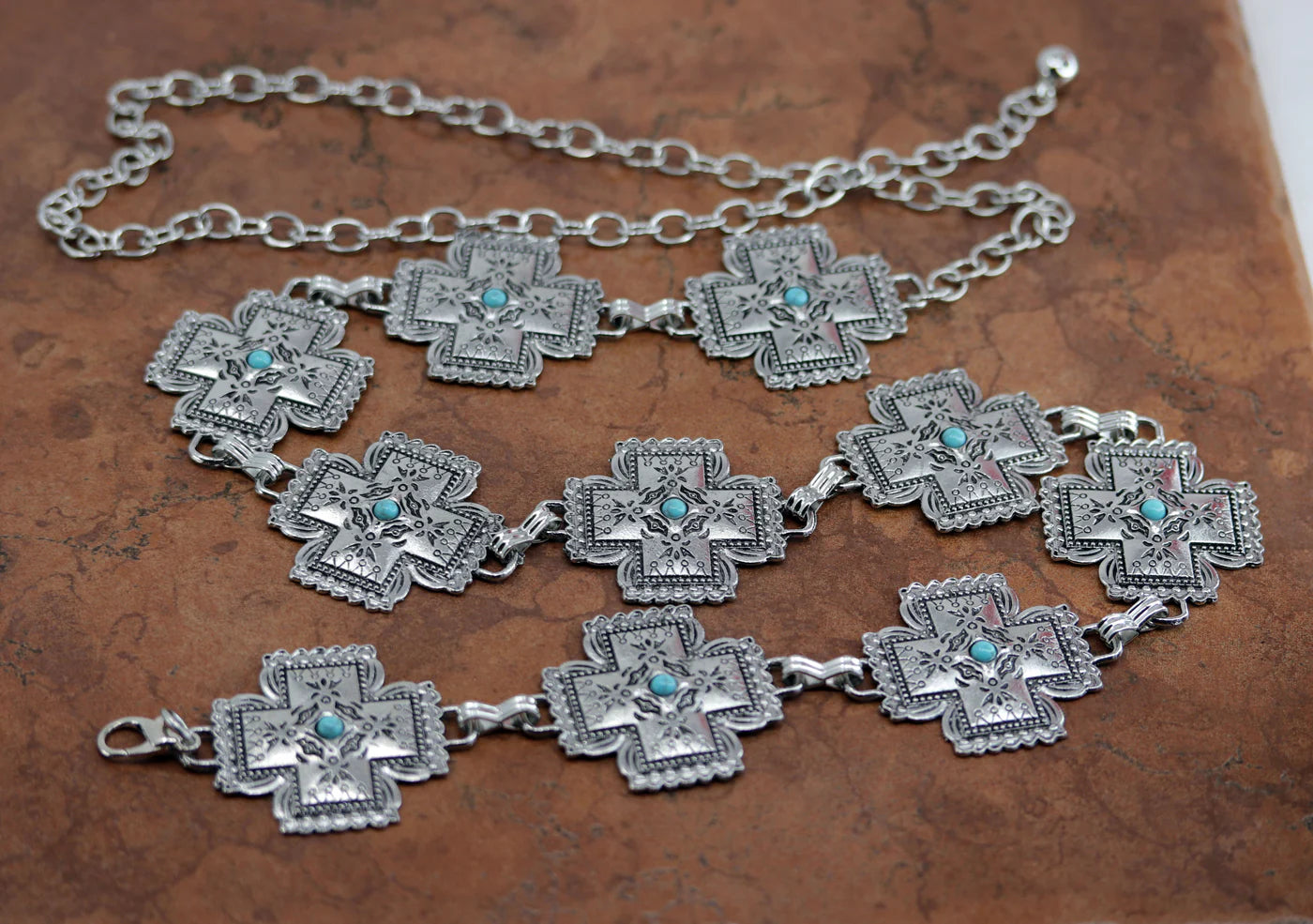 A beautiful fashion link belt made from zinc alloy and man made turquoise. The belt measures 50" in length and 1 7/8" in width (larger conchos).