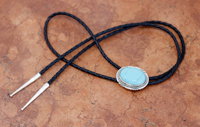 An authentic Navajo Native American Bolo Tie. The bolo tie is made of sterling silver and man made turquoise. The cord is about 38". The bolo measures 1 3/8" by 1 1/8".