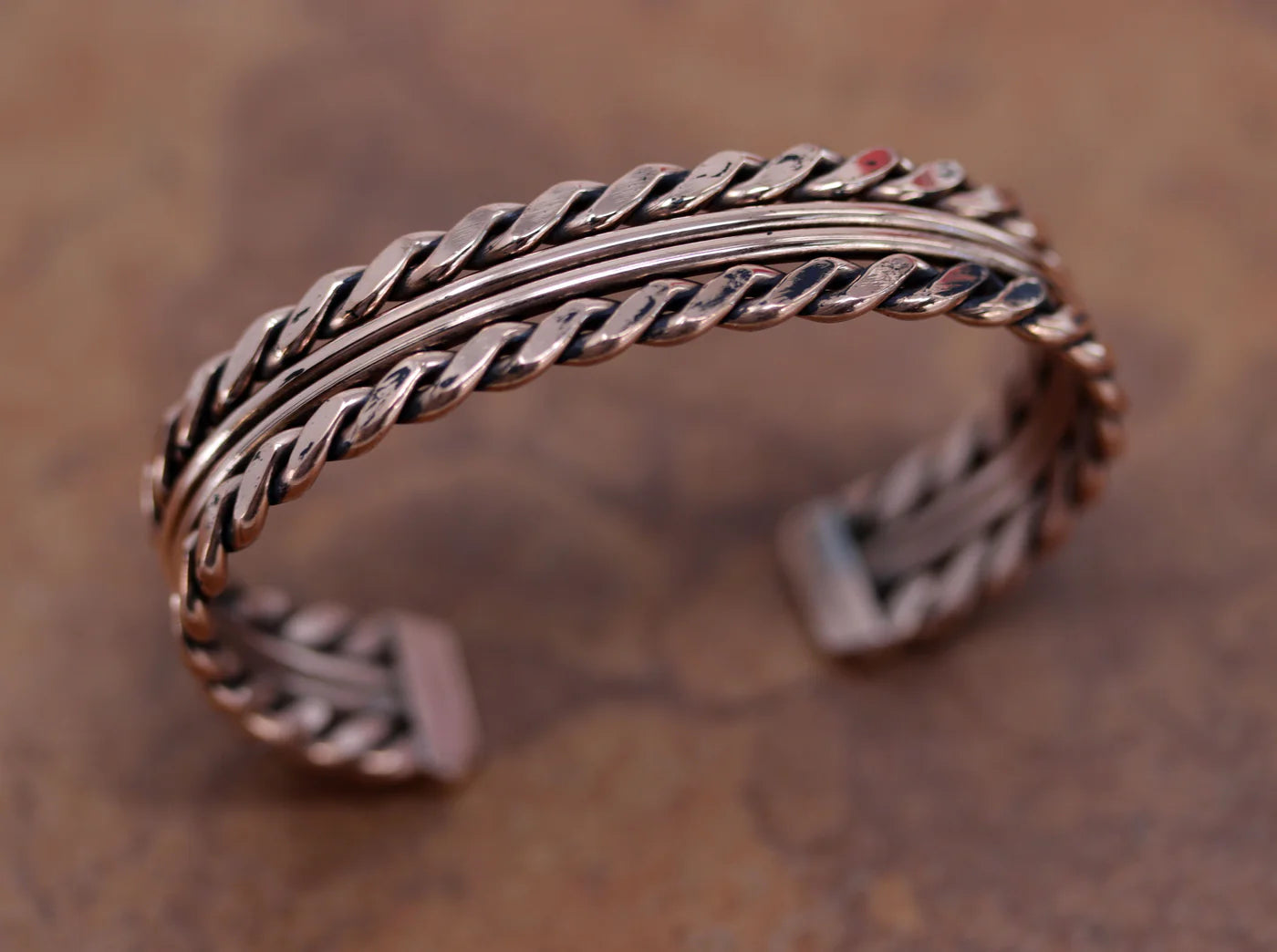 A beautiful Navajo Native American bracelet by Elaine Tahe. It is made from copper. It is about 5 1/4" around and about 5/8" wide at the widest point. The opening is about 1".