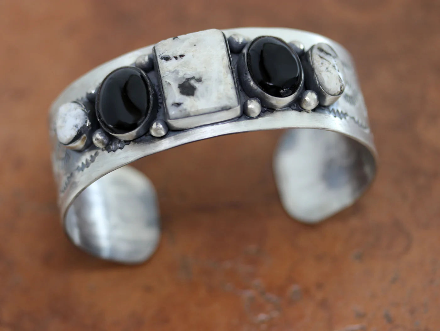 Beautiful Navajo Native American bracelet. It is made from sterling silver, onyx, and white buffalo. It is about 6 1/8" around and 1 1/8" wide. The opening is about 1 1/4", and it is partly flexible. It is stamped Sterling and J Johnson.