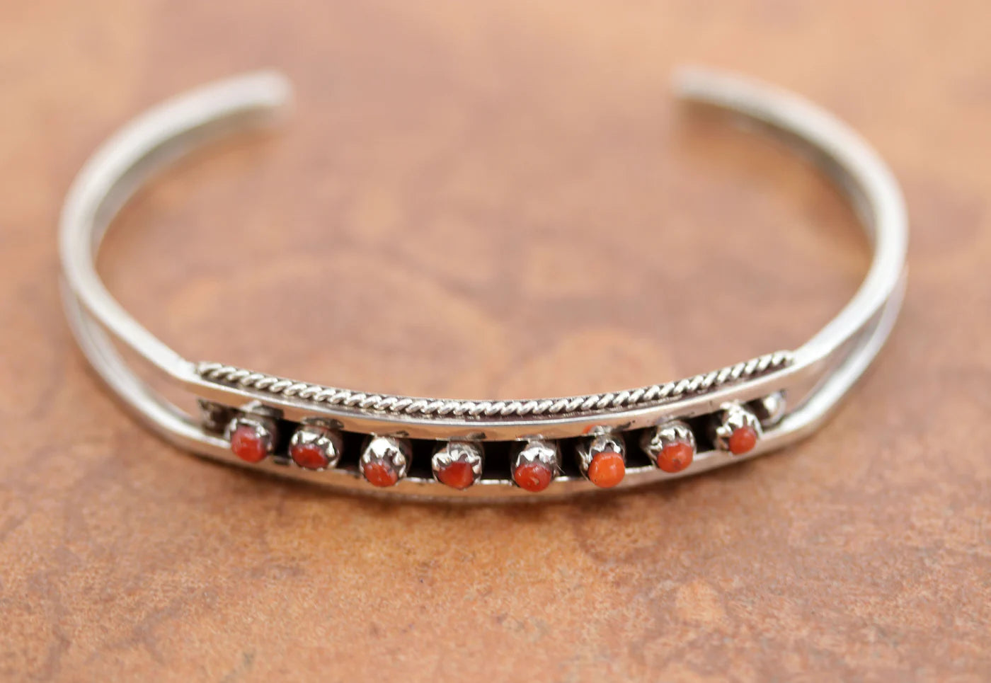 A brand new, very nice, authentic Zuni Native American bracelet. It is made from sterling silver and coral. It is about 5 3/8" around and about 5/16" wide at the widest point. The opening is about 1 1/4" and partly flexible.