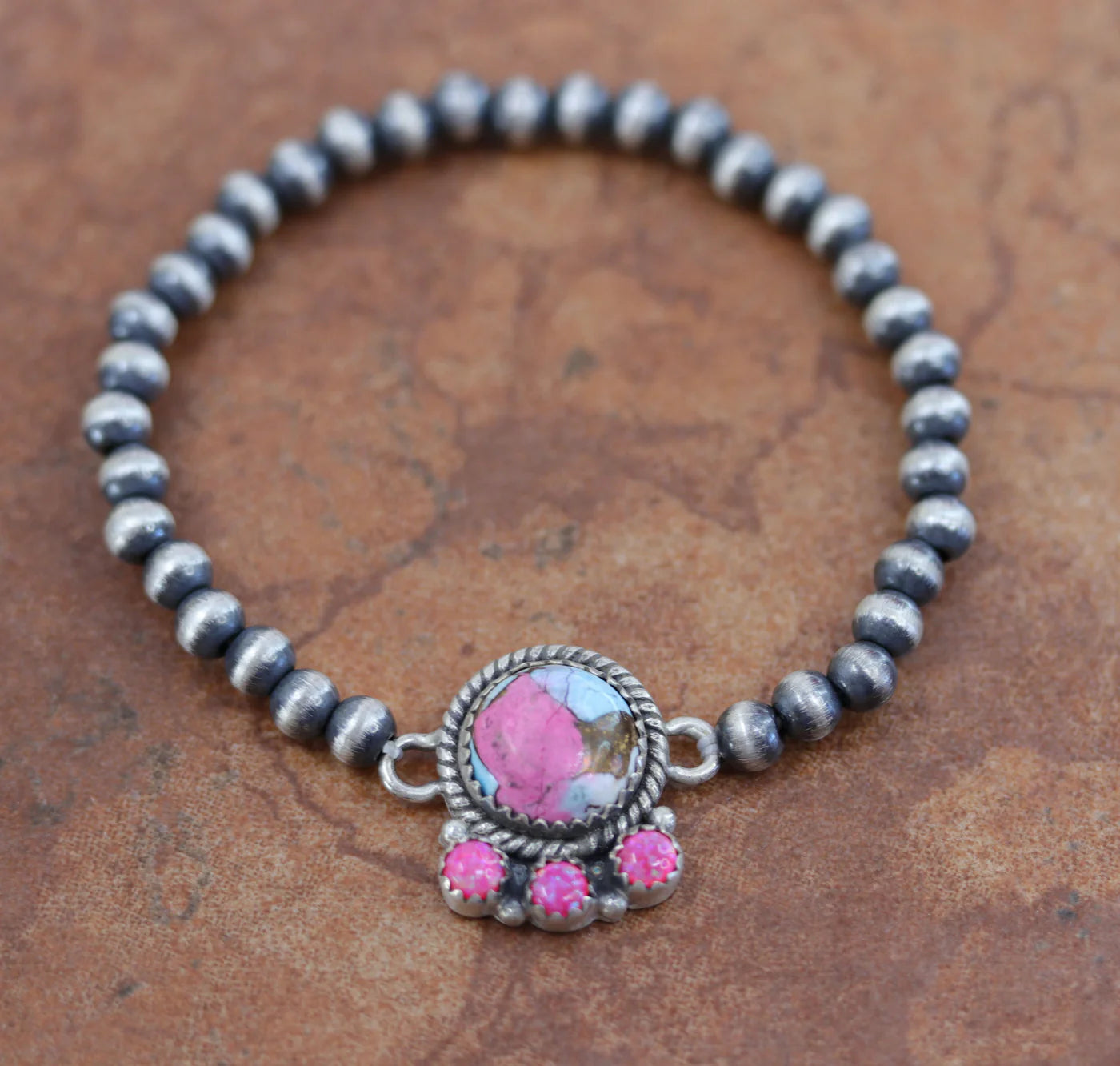 Beautiful bracelet that is about 6" from end to end and the width of the Desert pearls are 4 mm at the widest point. It is made from sterling silver, cotton candy dahlia, and created opal.