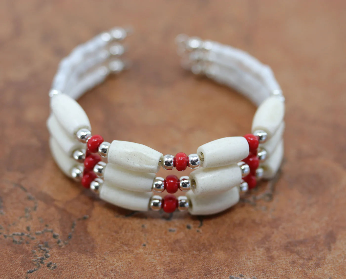 A beautiful Navajo Native American beaded bracelet. It is about 5 1/2" from end to end and the width is 7/8". The bracelet is very flexible so it will fit many different sizes.
