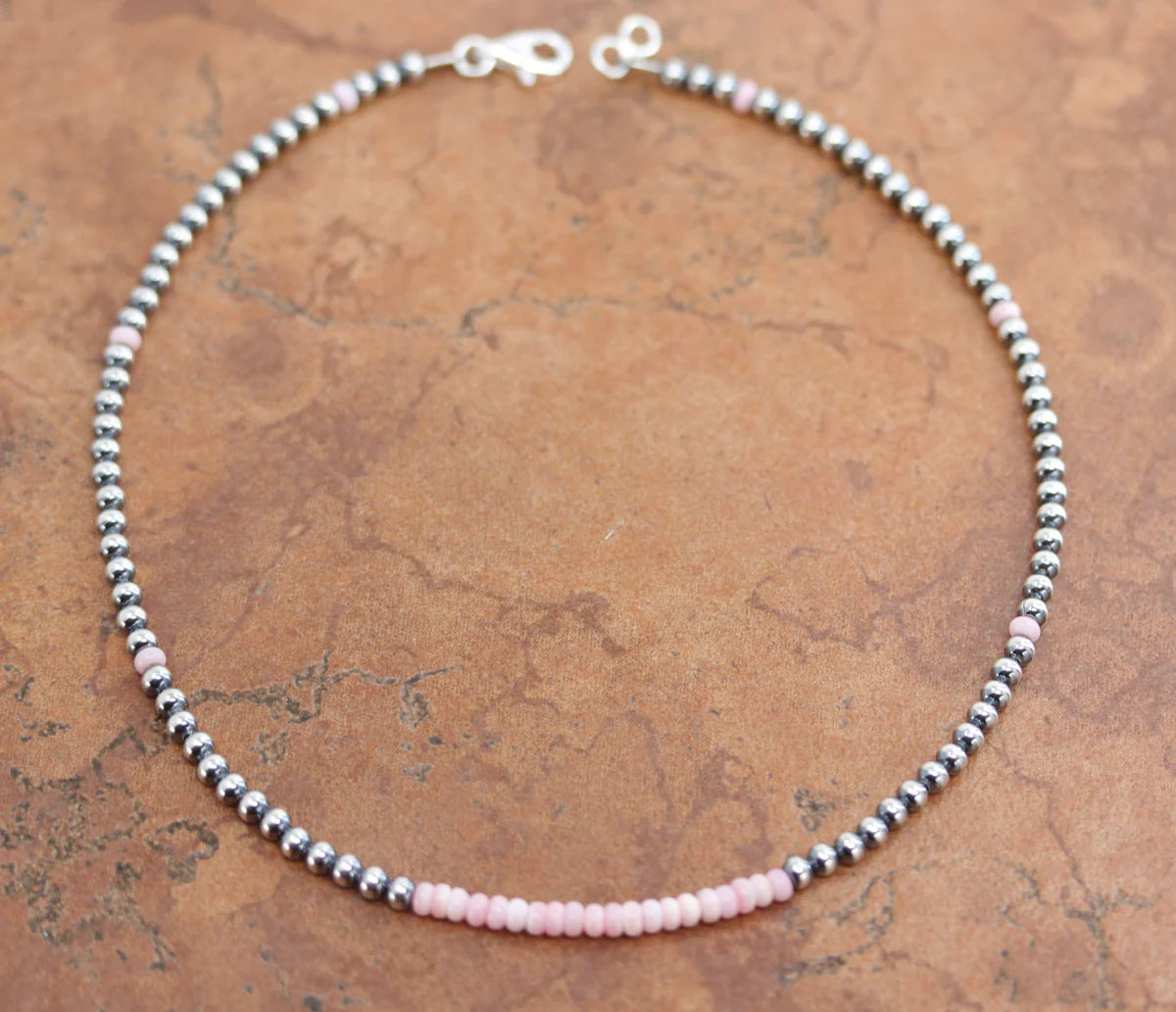 A beautiful silver Cowgirl Desert Pearl choker necklace with pink heishi. The necklace is 16" in length and the beads measure 4 mm.