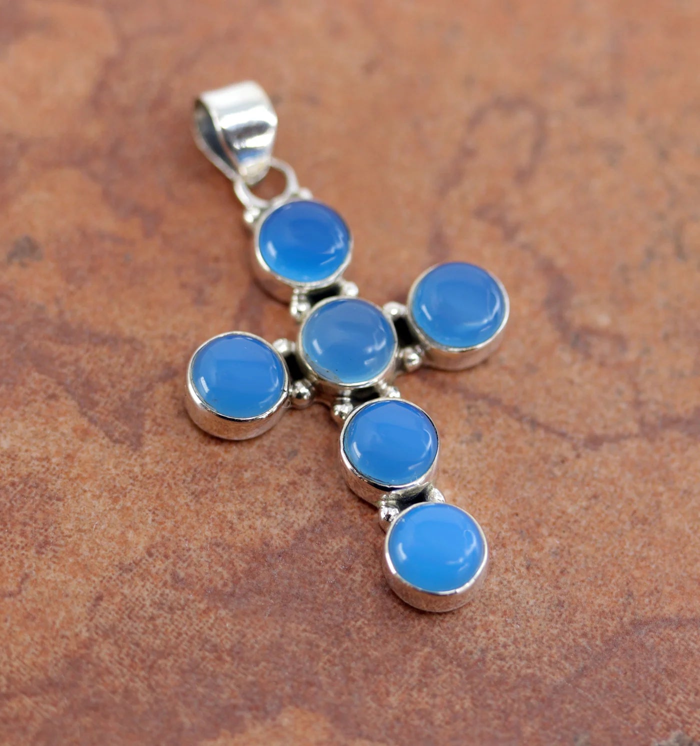 Beautiful pendant made from Sterling Silver and blue chalcedony. It is about 2" in length including the bail, and about 1 1/8" in width.