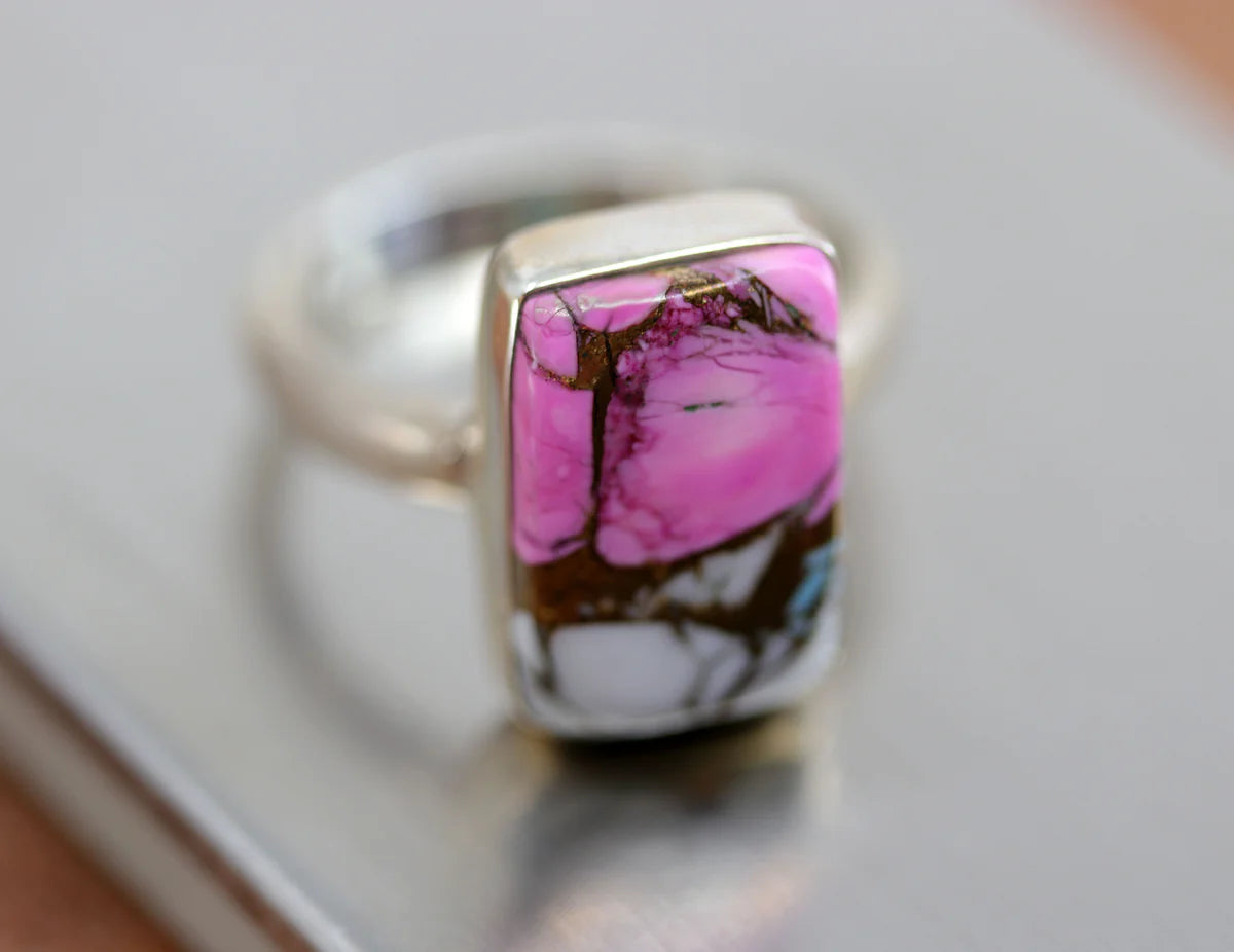 A beautiful Southwest Style gemstone ring made from sterling silver and cotton candy dahlia turquoise. The ring size is 7 1/2 and it is 3/4" in length.