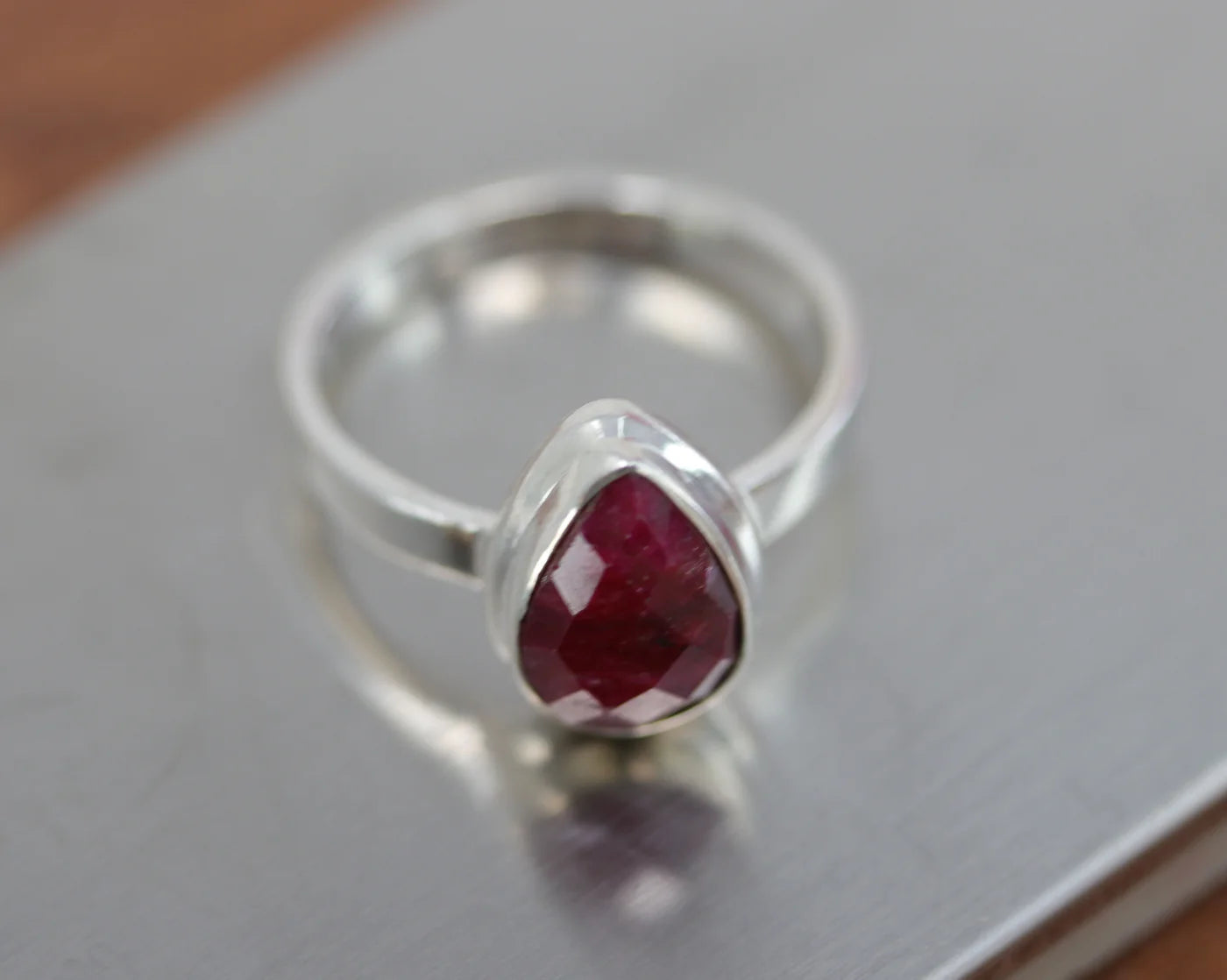 A beautiful Southwest Style gemstone ring made from sterling silver and ruby. The ring size is 7 and it is 1/2" in length.