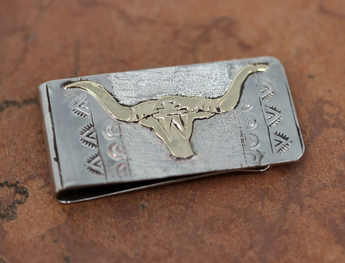 Beautiful Navajo Native American money clip. It is made from sterling silver, and gold overlay. The lower part of the money clip is made from nickel to give it more durability. It is about 1 3/4" in length and 1" wide.