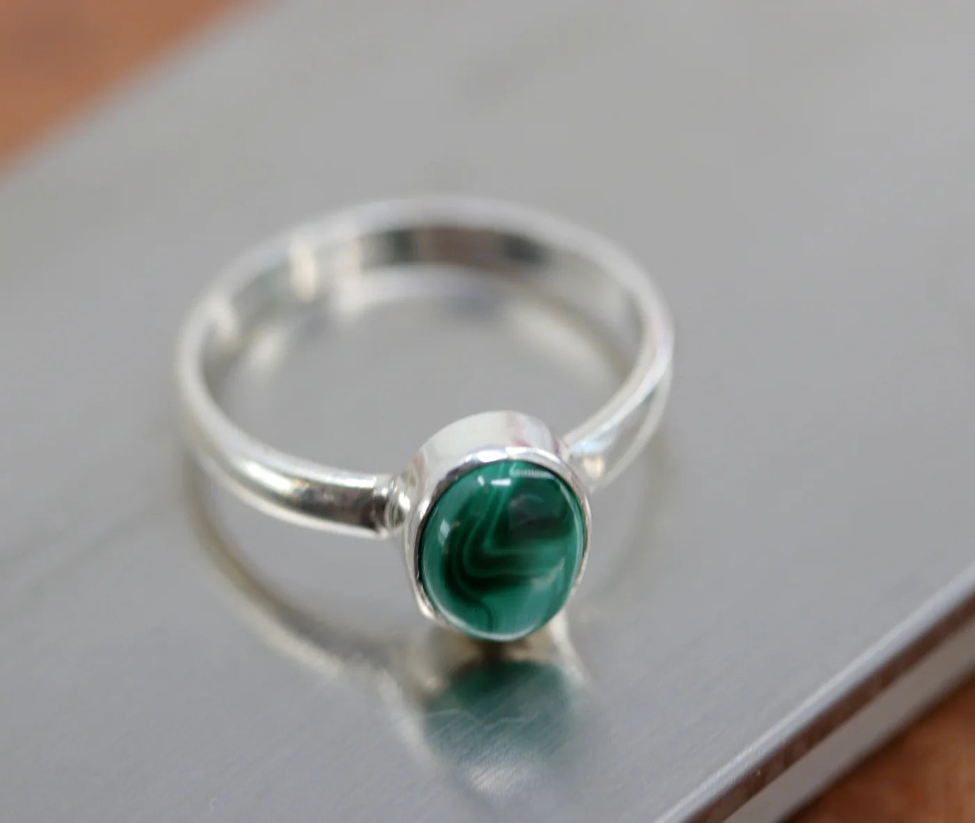 A beautiful Southwest Style gemstone ring made from sterling silver and malachite. The ring size is 8 1/2 and it is 1/2" in length.