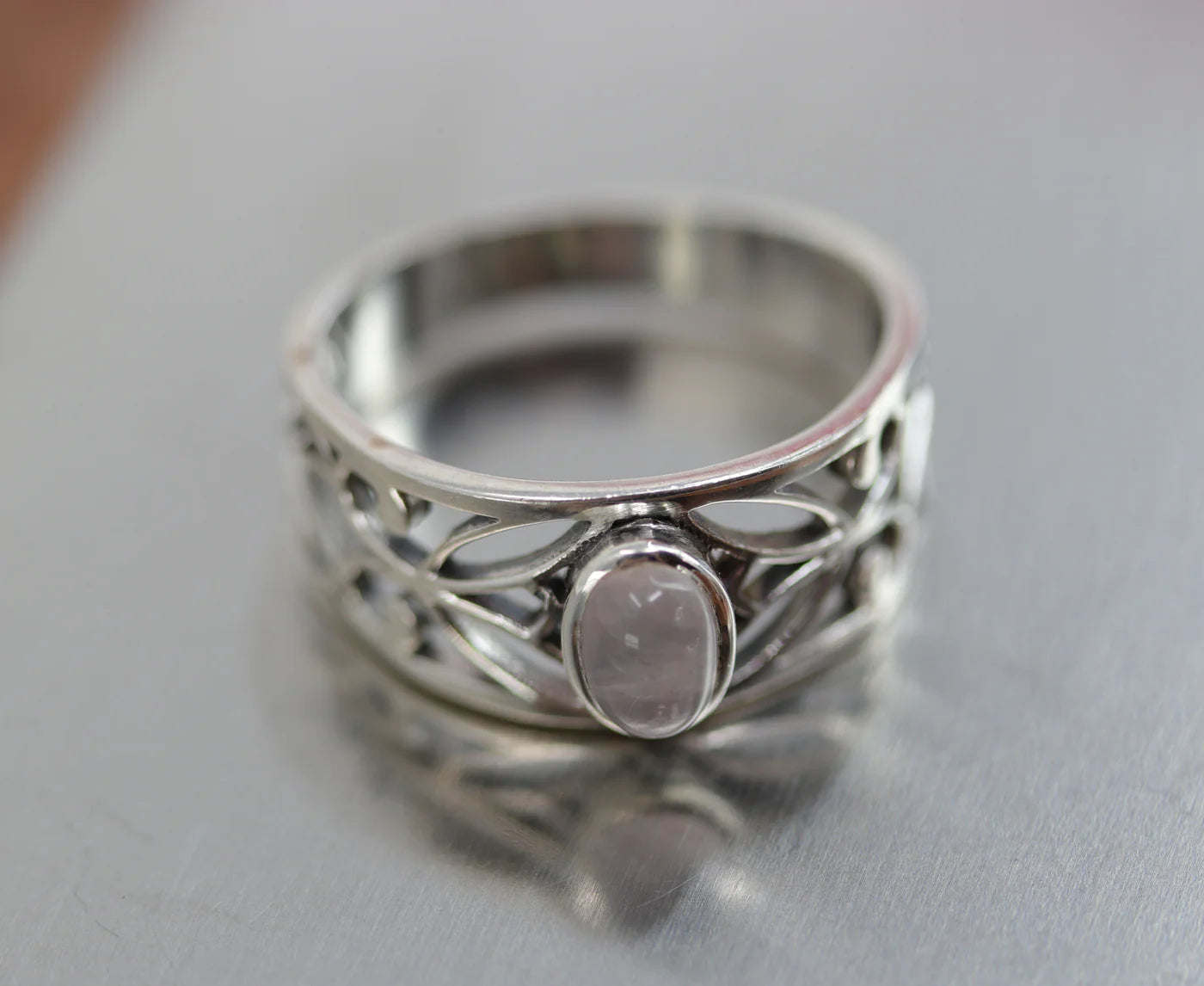 A beautiful Southwest Style gemstone ring made from sterling silver and moonstone. The ring size is 7 and it is 3/8" in length.