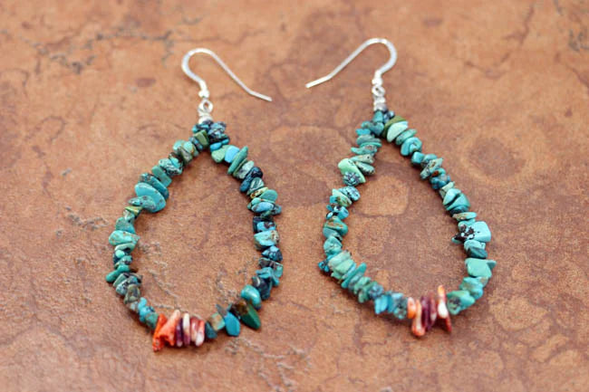 Beautiful Navajo Nugget Earrings. They are made from sterling silver, spiny oyster, and turquoise nuggets. The earrings about 3 1/2" long including the hook and the nuggets are 1/2" wide.