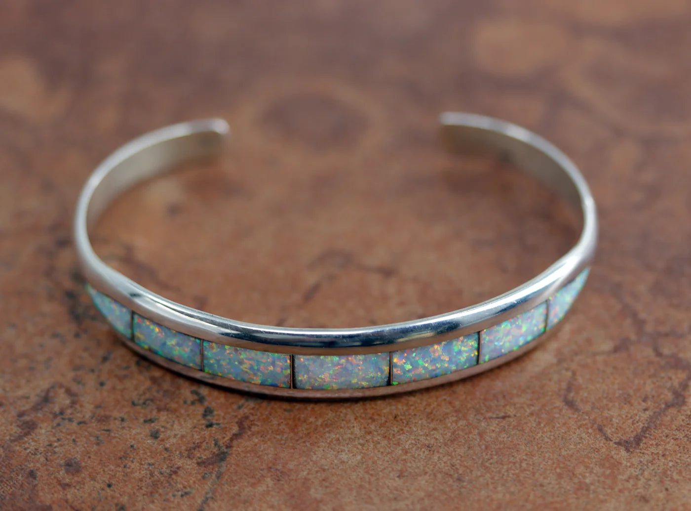 An authentic Navajo Native American bracelet. It is made from sterling silver and created opal. It is about 5 1/2" around and about 1/2" wide at the widest point. The opening is about 1".