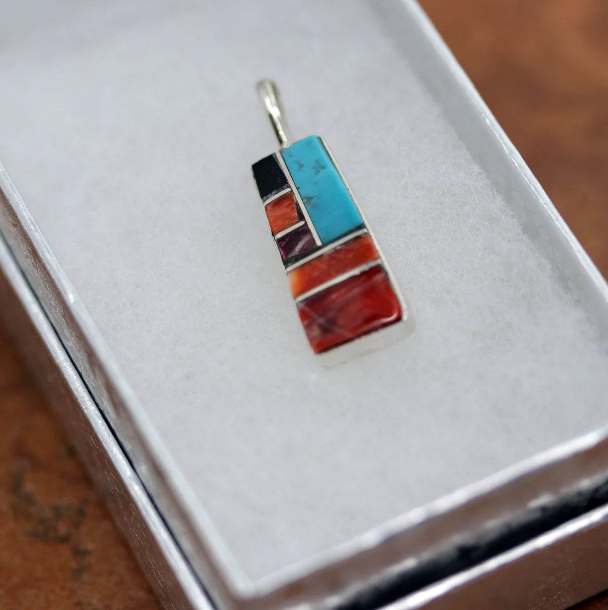 A beautiful Navajo Native American Pendant. It is made from sterling silver and multi-stone inlay. It is 1 1/8" long and about 3/8" wide.