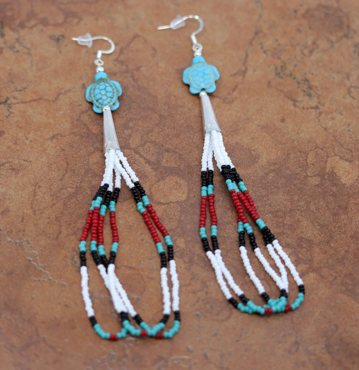 Beautiful Navajo Native American earrings. They are made from sterling silver. The earrings are about 5 1/2" in length including the hook, and the turtle is 5/8" in width. Please note the patterns and colors of the beads can vary.