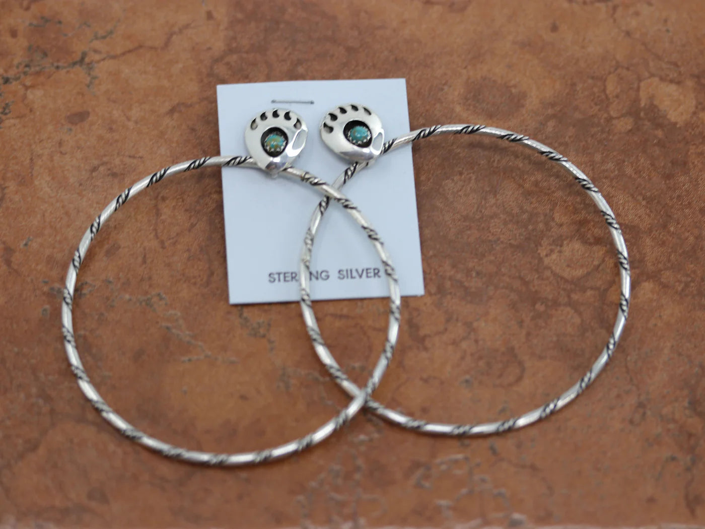 Sterling Silver Navajo Turquoise Bear Paw Hoop Wire Earrings