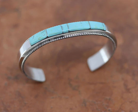 Beautiful Navajo Native American bracelet. It is made from sterling silver and turquoise. It is about 5 1/4" around and about 1/2" wide at the widest point. It is stamped F for Fran Yazzie and Sterling. The opening is about 1 1/4".
