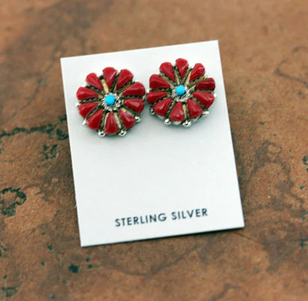 Sterling Silver Navajo Turquoise Coral Cluster Earrings