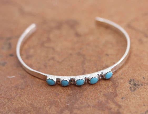 Beautiful Navajo Native American childrens bracelet. It is made from sterling silver and turquoise. It is about 3 1/2" around and about 3/16" wide at the widest point. The opening is about 3/4", and partly flexible.