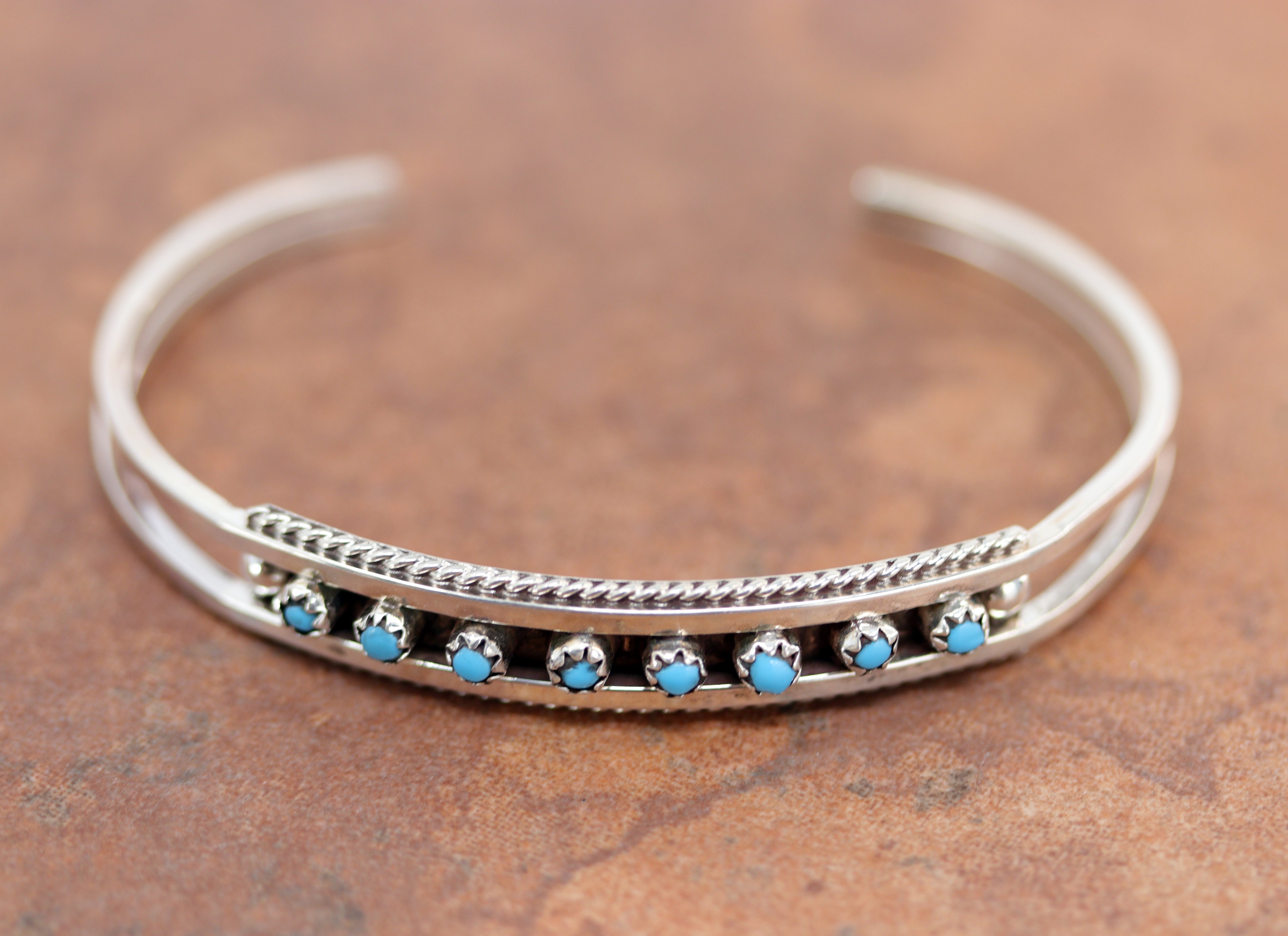 A brand new, very nice, authentic Zuni Native American bracelet. It is made from sterling silver and turquoise. It is about 5 3/8" around and about 5/16" wide at the widest point. The opening is about 1 1/4" and partly flexible.