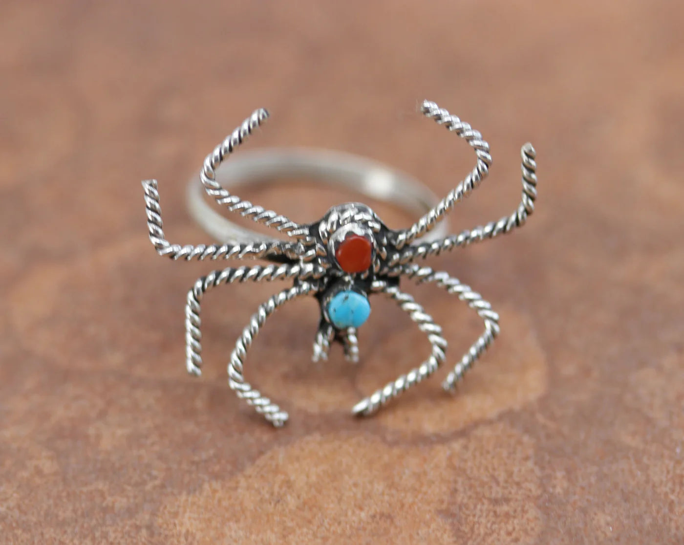 Sterling Silver Zuni Turquoise Coral Spider Ring Size 6 1/2