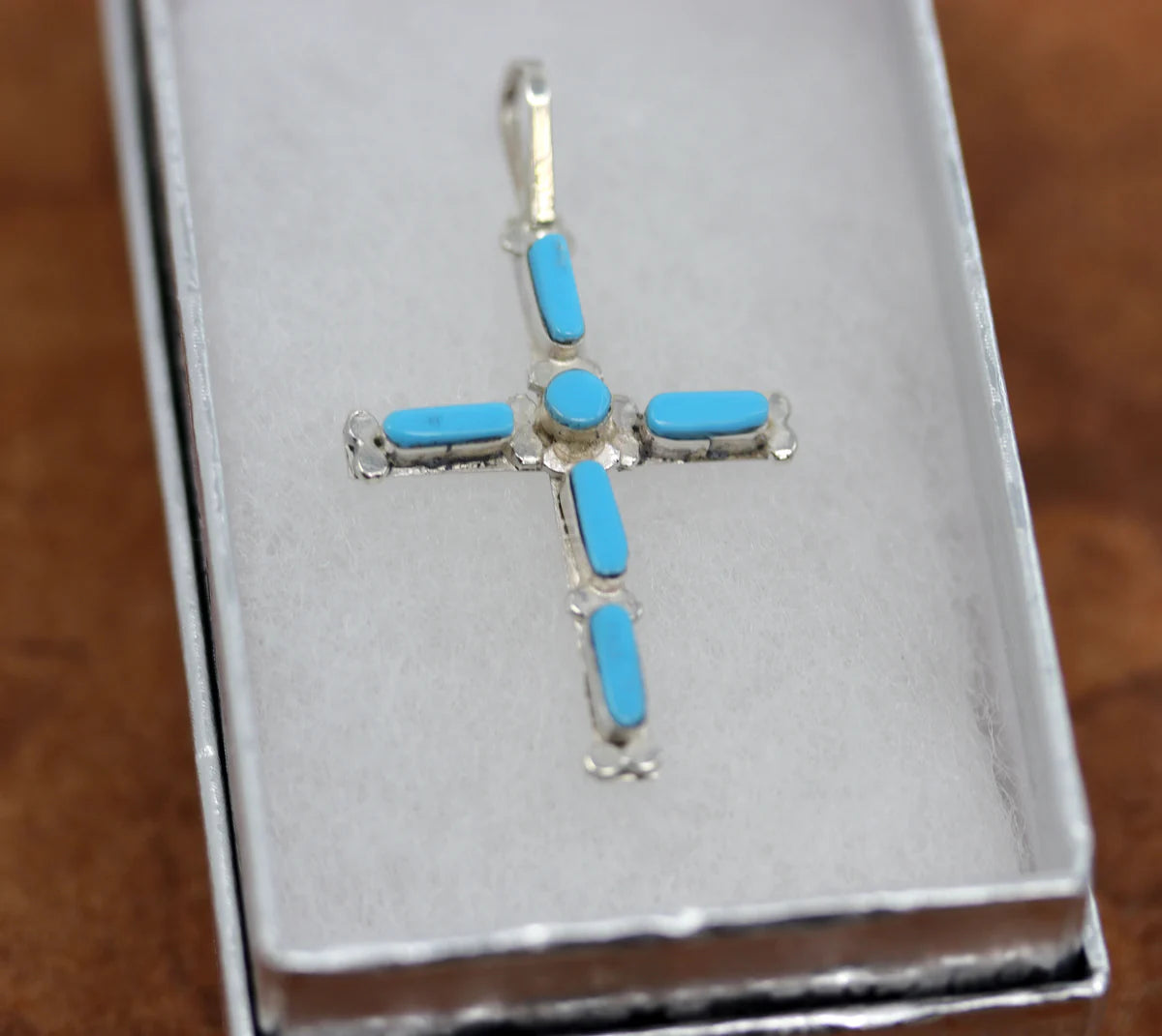 A beautiful Zuni Native American Cross Pendant. It is made from Sterling Silver and turquoise. It is about 1 5/8" in length including the bail, and about 1" in width.