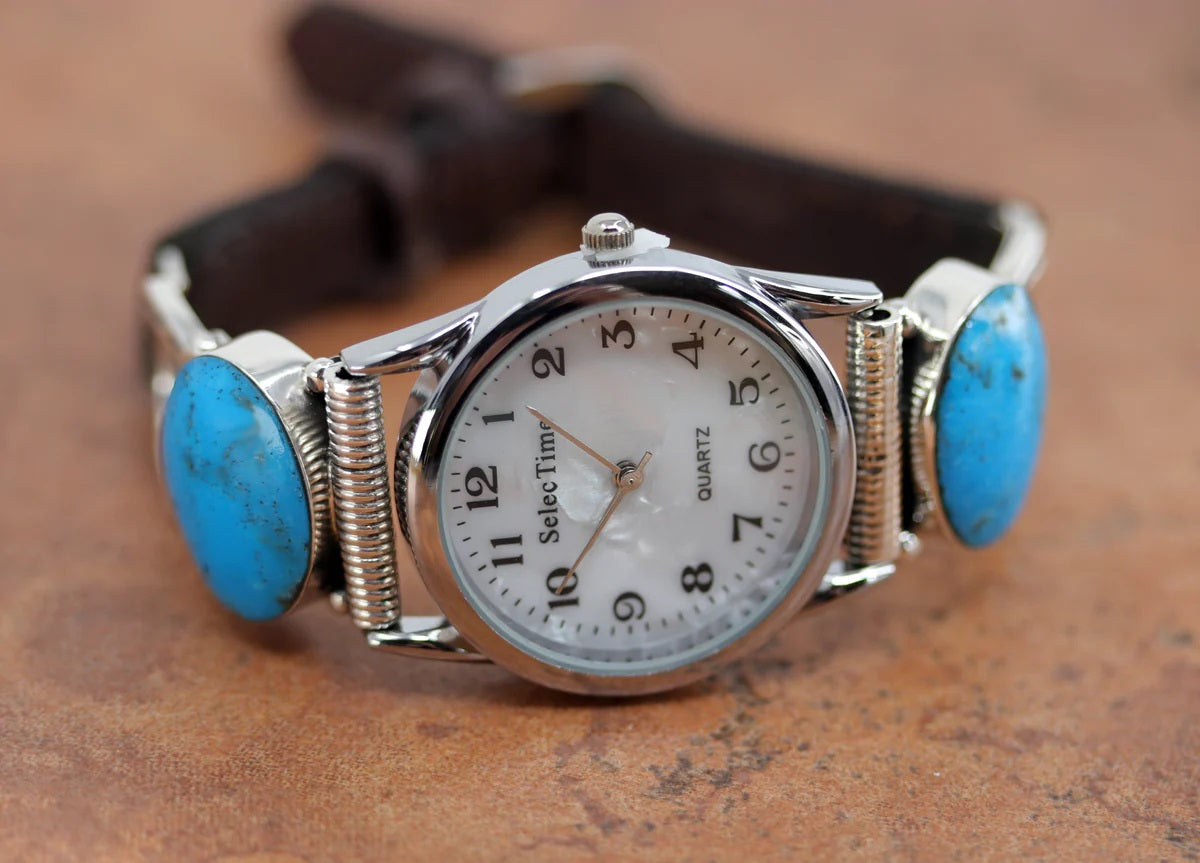 A beautiful Navajo Native American watch made by Gilbert Smith. It is made from sterling silver, turquoise, and leather. It is 9" in length and about 7/8" in width.