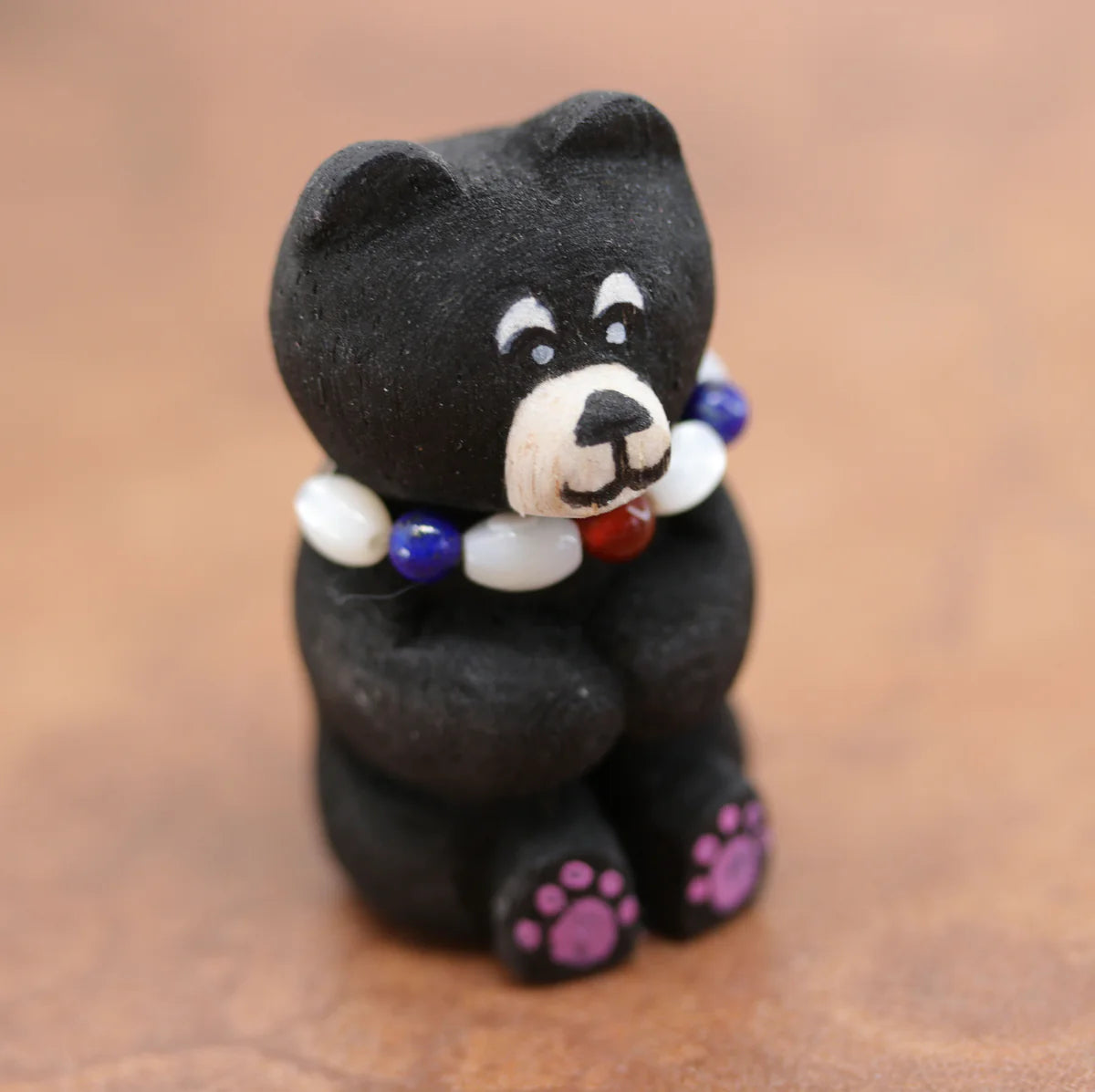 A cute Navajo Native American carved bear figurin. The bear is wearing a beaded gemstone necklace. It measures 2" in length, and 1 1/8" in width at the widest point.