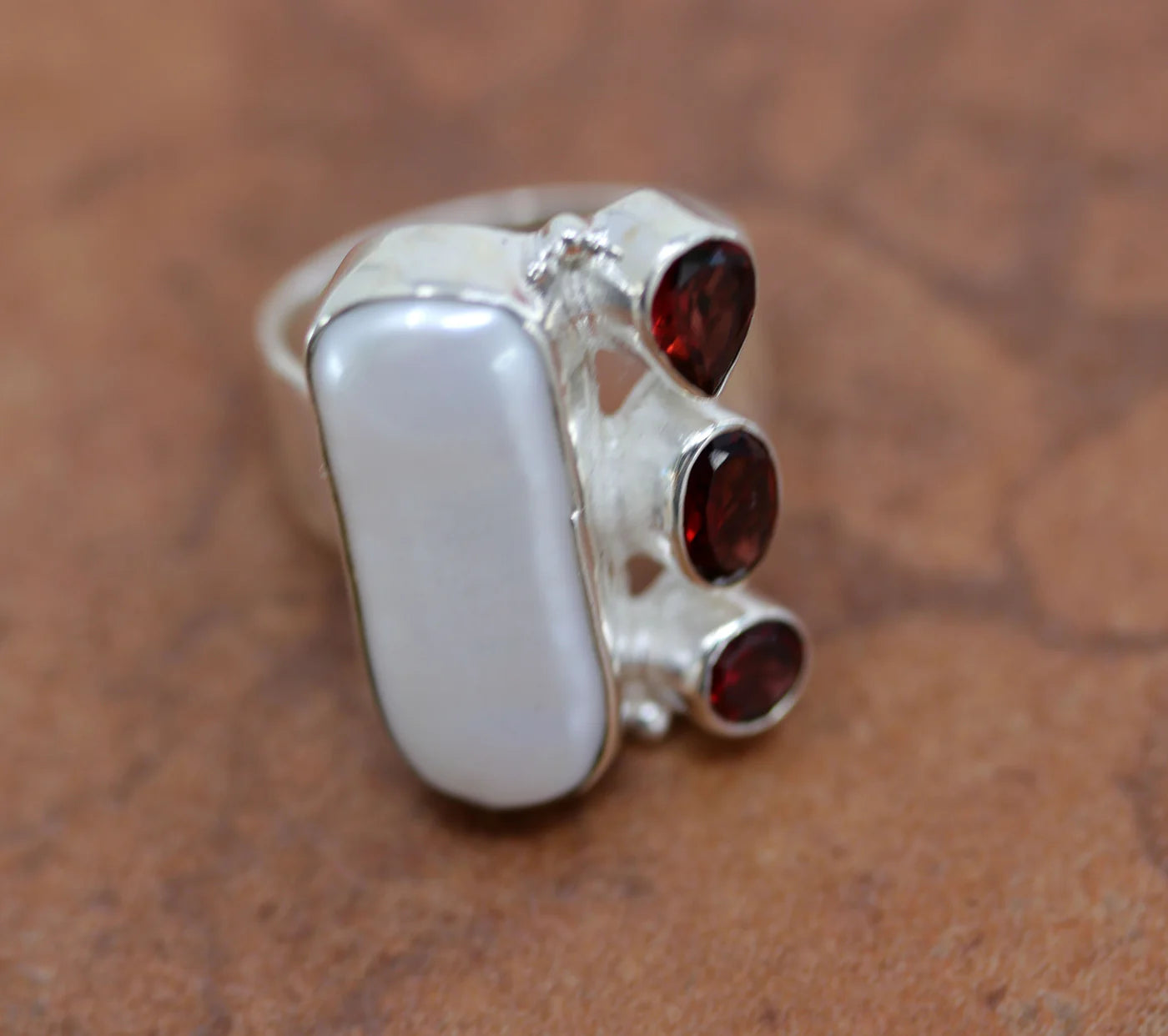 Sterling Silver Pearl Garnet Ring Size 7 1/2