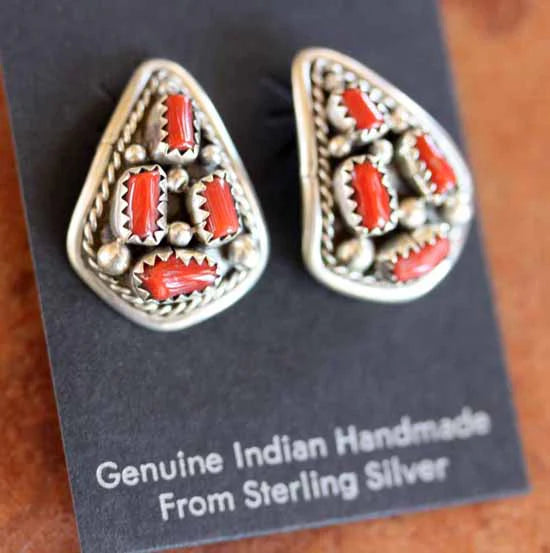 Sterling Silver Navajo Coral Bear Paw Earrings