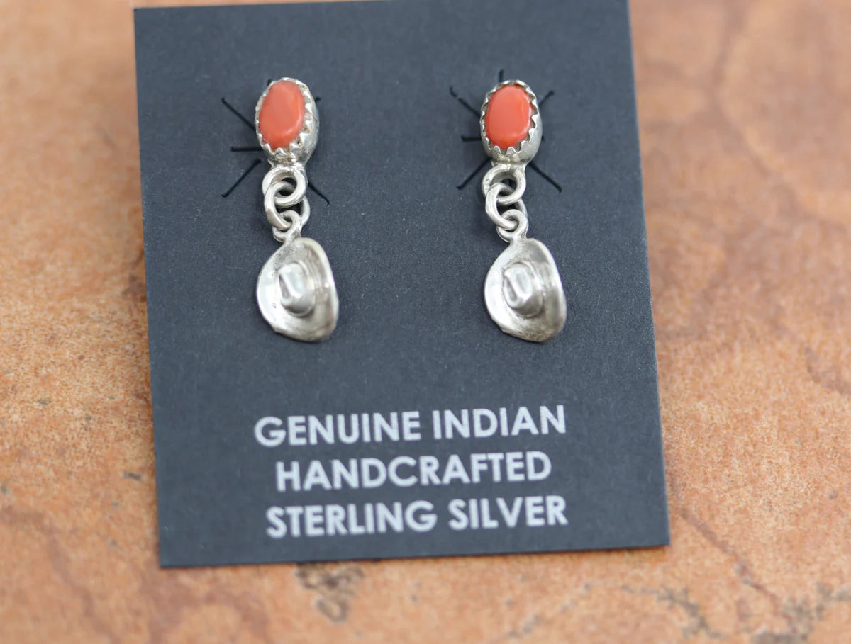 Sterling Silver Navajo Coral Cowboy Hat Earrings
