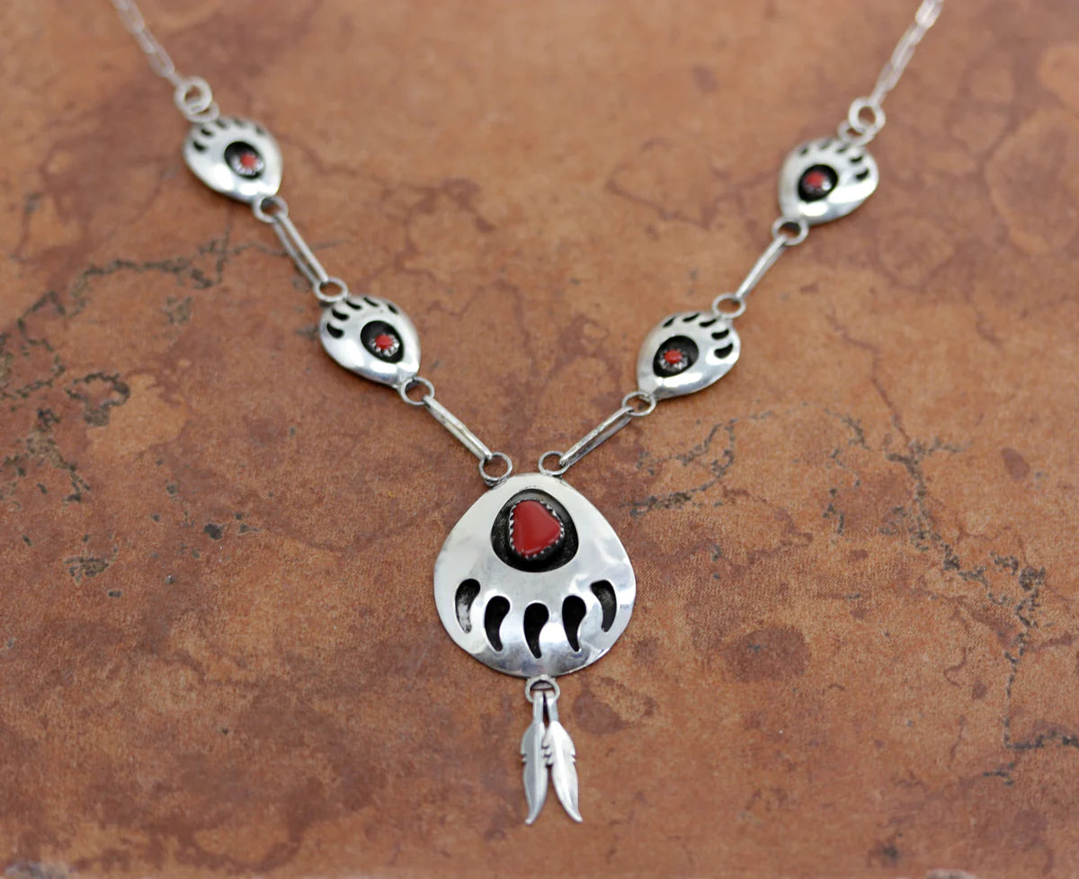 Sterling Silver Navajo Coral Bear Paw Necklace