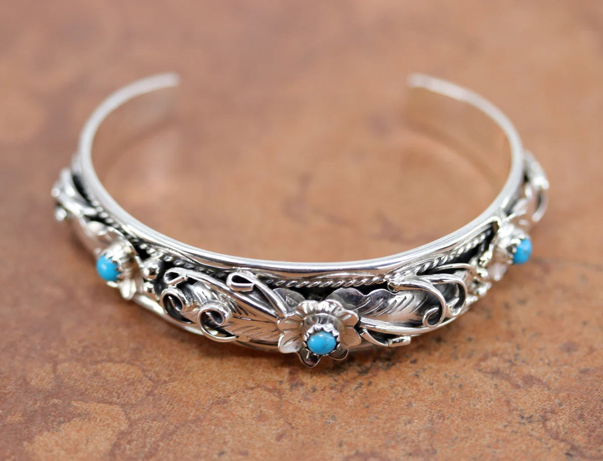 Sterling Silver Navajo Turquoise Floral Cuff Bracelet