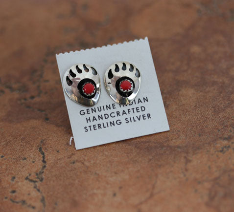 Sterling Silver Navajo Coral Bear Paw Earrings
