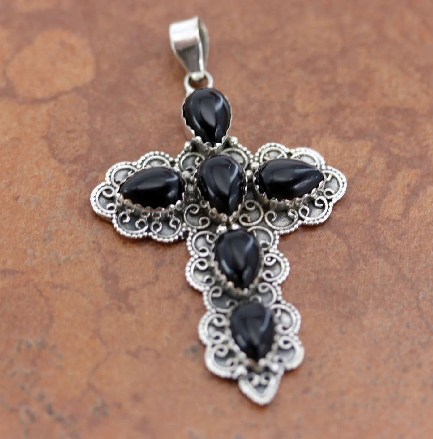 Beautiful pendant made from Sterling Silver and onyx. It is about 2 5/8" in length including the bail, and about 1 5/8" in width.
