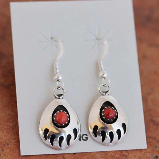 Sterling Silver Navajo Coral Bear Paw Earrings