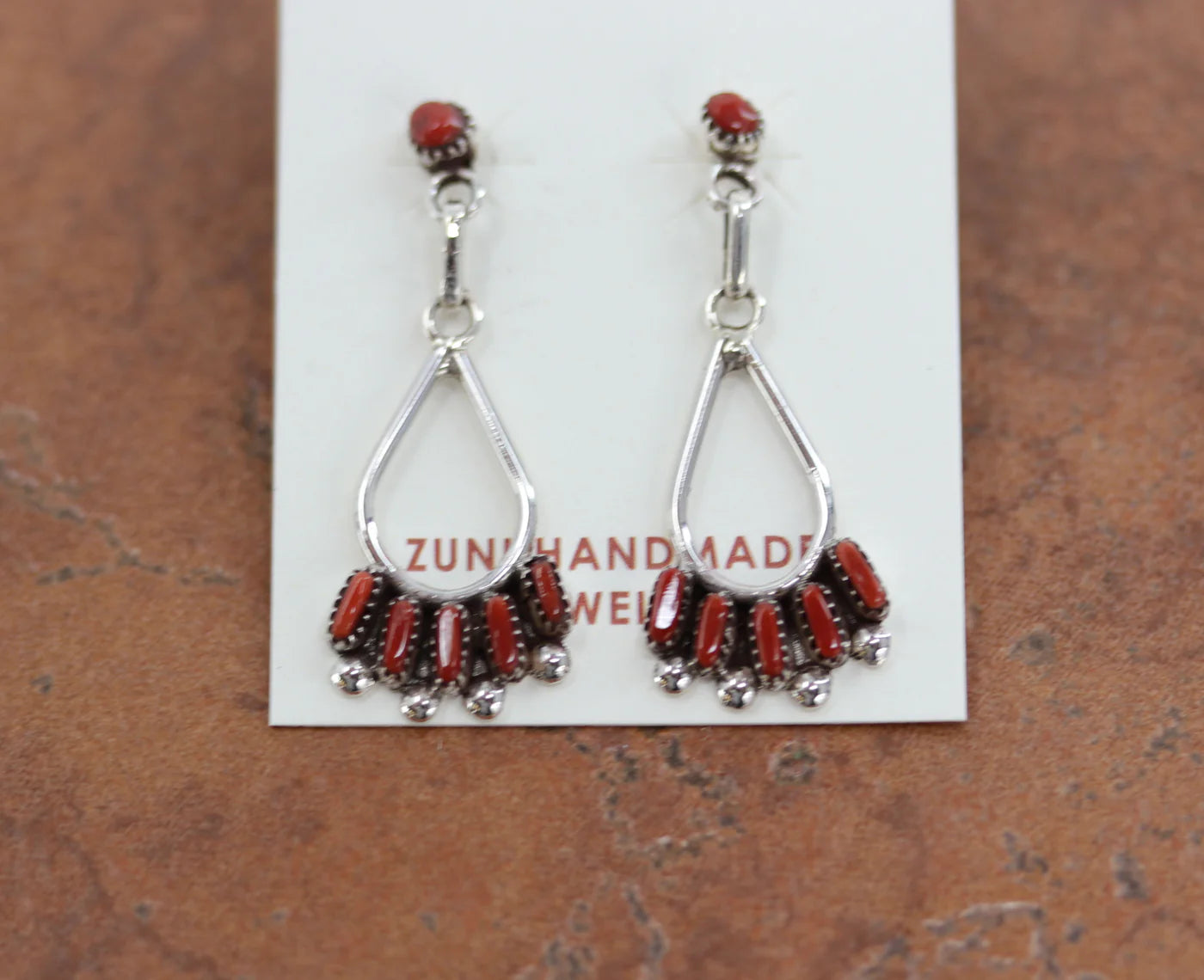 Beautiful Zuni Native American earrings. They are made from sterling silver and coral. Each earring is 1 5/8" in length, and about 5/8" in width.