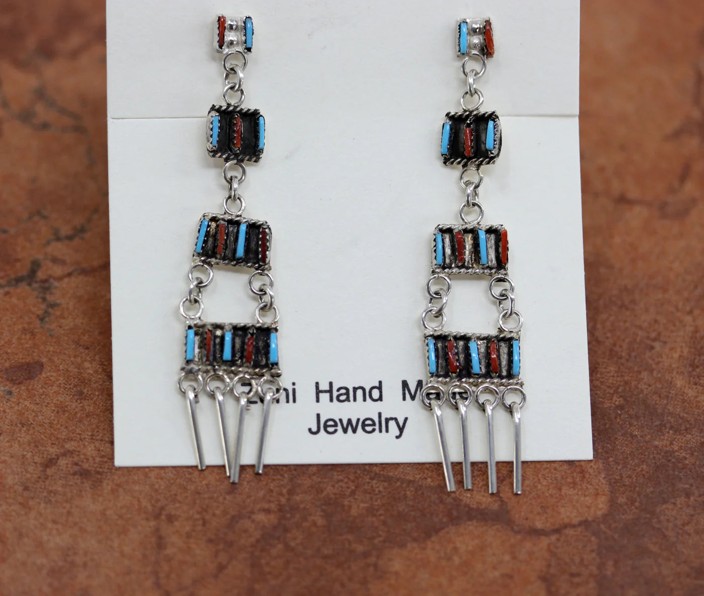 Sterling Silver Zuni Turquoise Coral Needlepoint Earrings