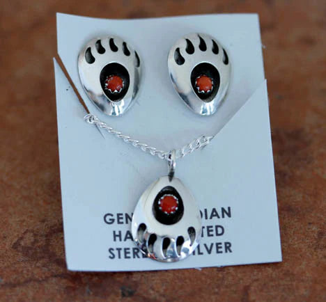 Sterling Silver Navajo Coral Bear Paw Necklace and Earrings Set