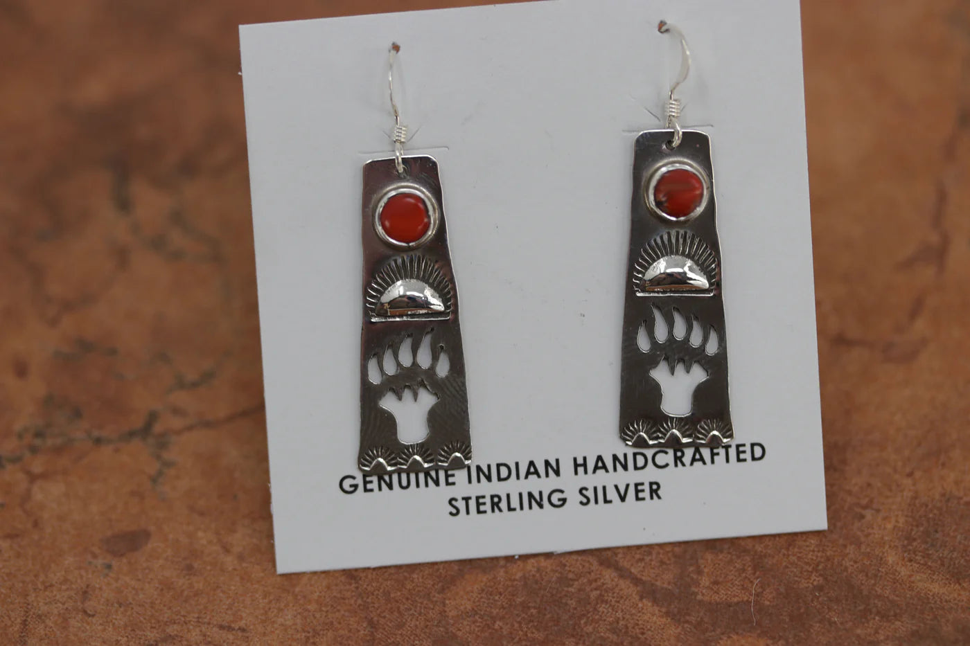 Sterling Silver Navajo Coral Bear Paw Earrings