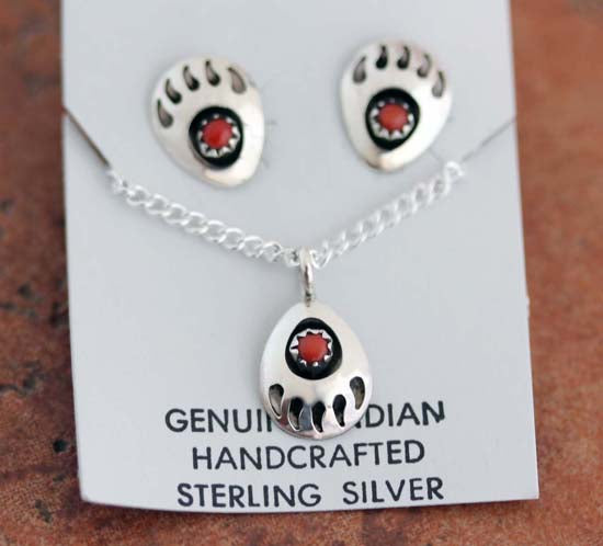 Sterling Silver Navajo Coral Bear Paw Necklace Earrings Set