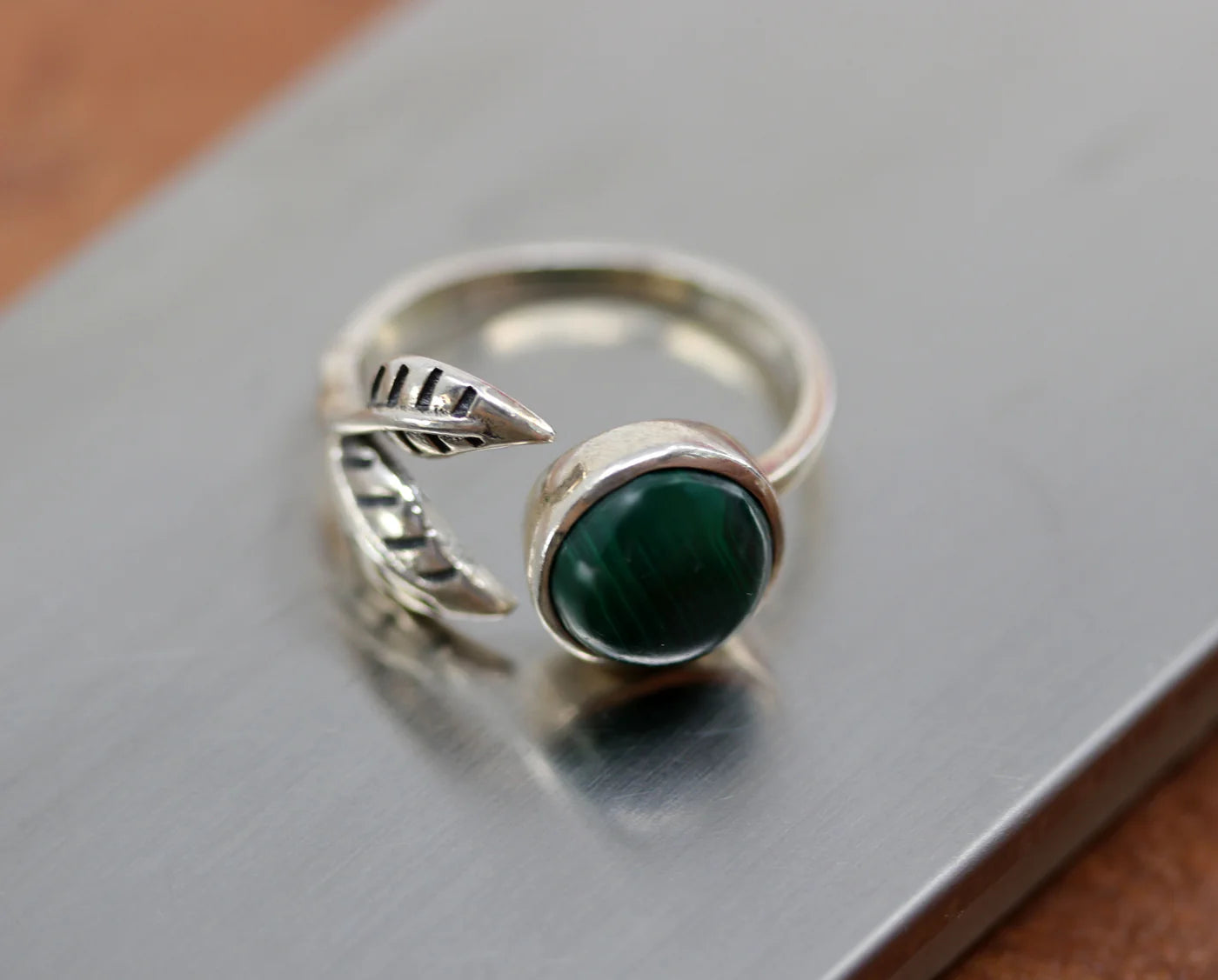 A beautiful Southwest Style gemstone ring made from sterling silver and malachite. The ring size is adjustable and fits sizes 7 to 9 and it is 1/2" in length.