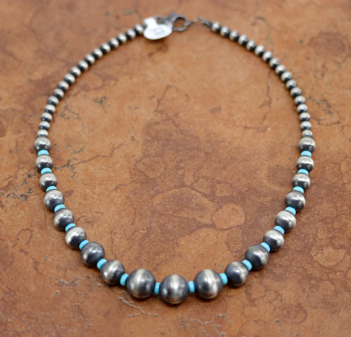 A beautiful silver Navajo Native American necklace. The necklace is 16" in length and the beads measure 5/8" at the widest point.