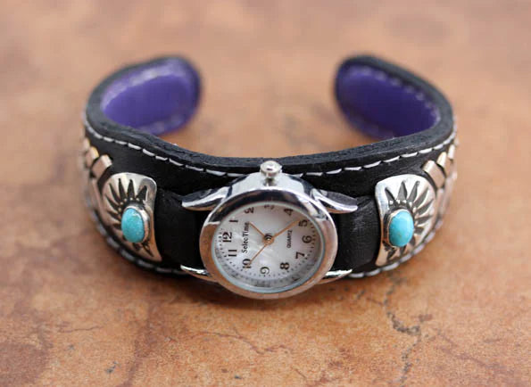 A beautiful brand new Navajo Native American watch. It is made from sterling silver, turquoise, and leather. The watch bracelet is 5 3/4" around and about 1 1/8" in width. The opening is 1" and partly flexible.