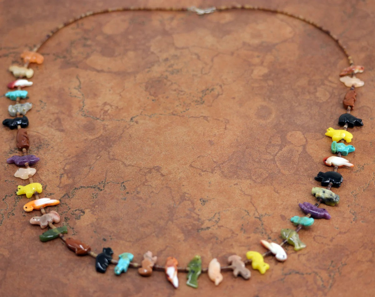 A beautiful Navajo Native American animal fetish necklace. The necklace is 30" in length, and the animals measure about 1" in width.