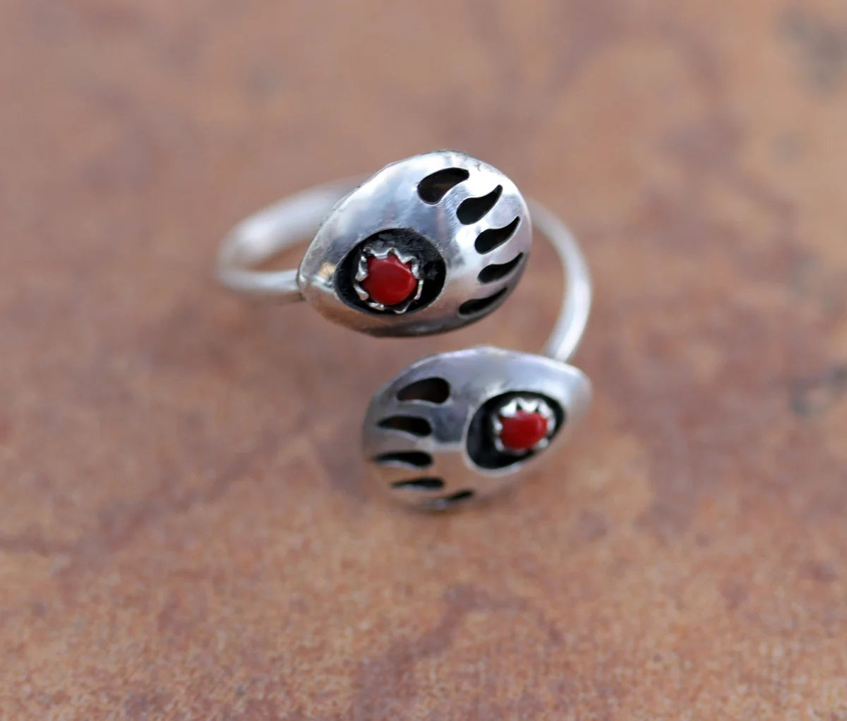Sterling Silver Navajo Coral Bear Paw Spoon Ring Size 6-9