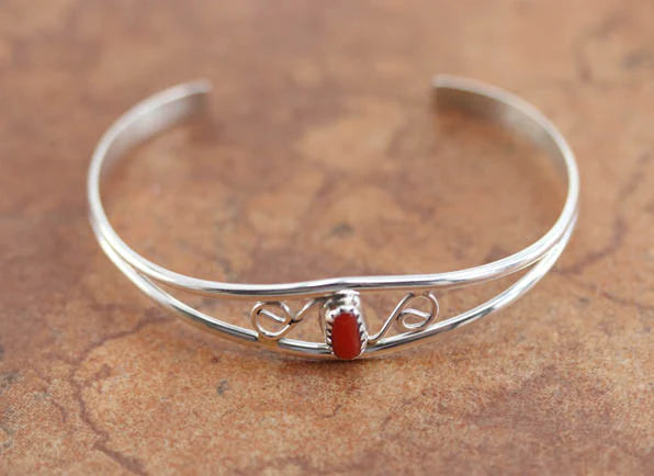 Beautiful Navajo Native American bracelet by Judy Lincoln. It is made from sterling silver and coral. It is about 5" around and 1/2" wide. The opening is about 1", and it is partly flexible.
