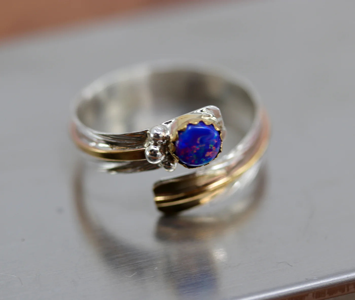 A beautiful Navajo Native American feather ring. It is made from sterling silver and created opal. The size is adjustable so it can fit sizes 6-9, and it is 3/4" at the widest point.