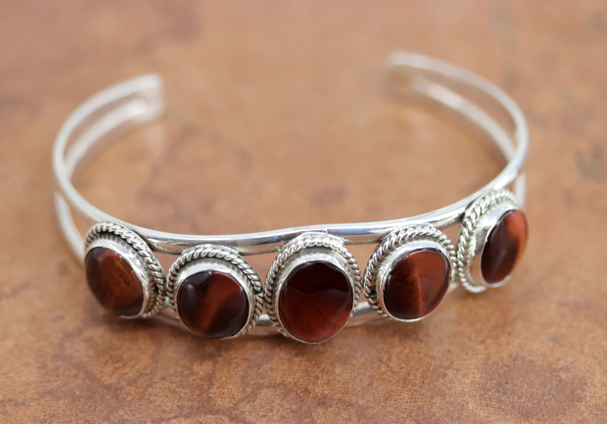 Beautiful Navajo Native American bracelet. It is made from sterling silver and tiger eye. It is about 5 3/4" around and about 7/8" wide at the widest point. The opening is about 1 1/2", and partly flexible.